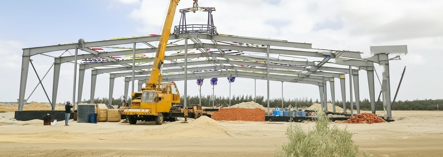 Delivered components are organized and assembled to form the steel structure, followed by cladding installation and all related works.